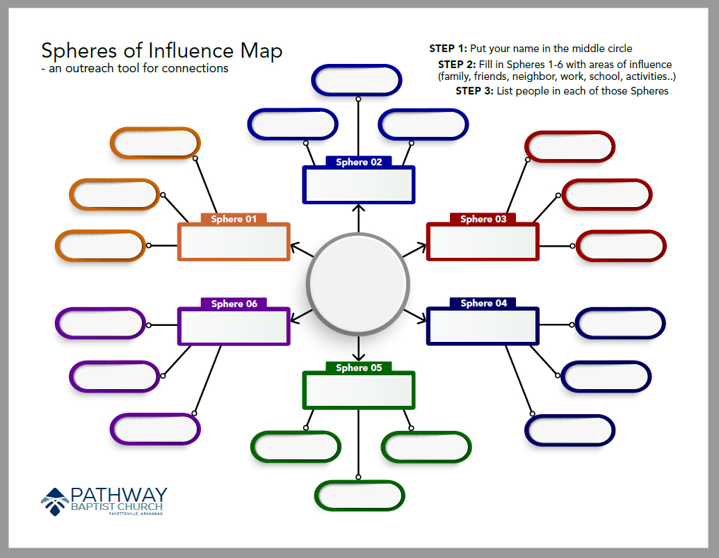 During the first message in our "Spheres of Influence" series, Jeremy introduced a tool to help identify the people in our lives who we have the ability to impact with the gospel of Jesus Christ. Whether it is to invite someone to worship, Bible study, or another activity at Pathway or if we plan to have a gospel conversation, the people we already know are the ones who we have the best opportunity to reach. For more details, listen to our message from 3/30/2025. There are also a few more details below. If you know what to do, then download and get started!